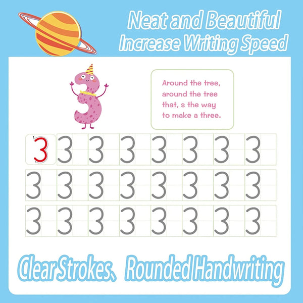 Surcos guía, tinta que desaparece y gráficos ayudan a practicar letras y números repetidamente hasta dominar la caligrafía y ganar confianza.